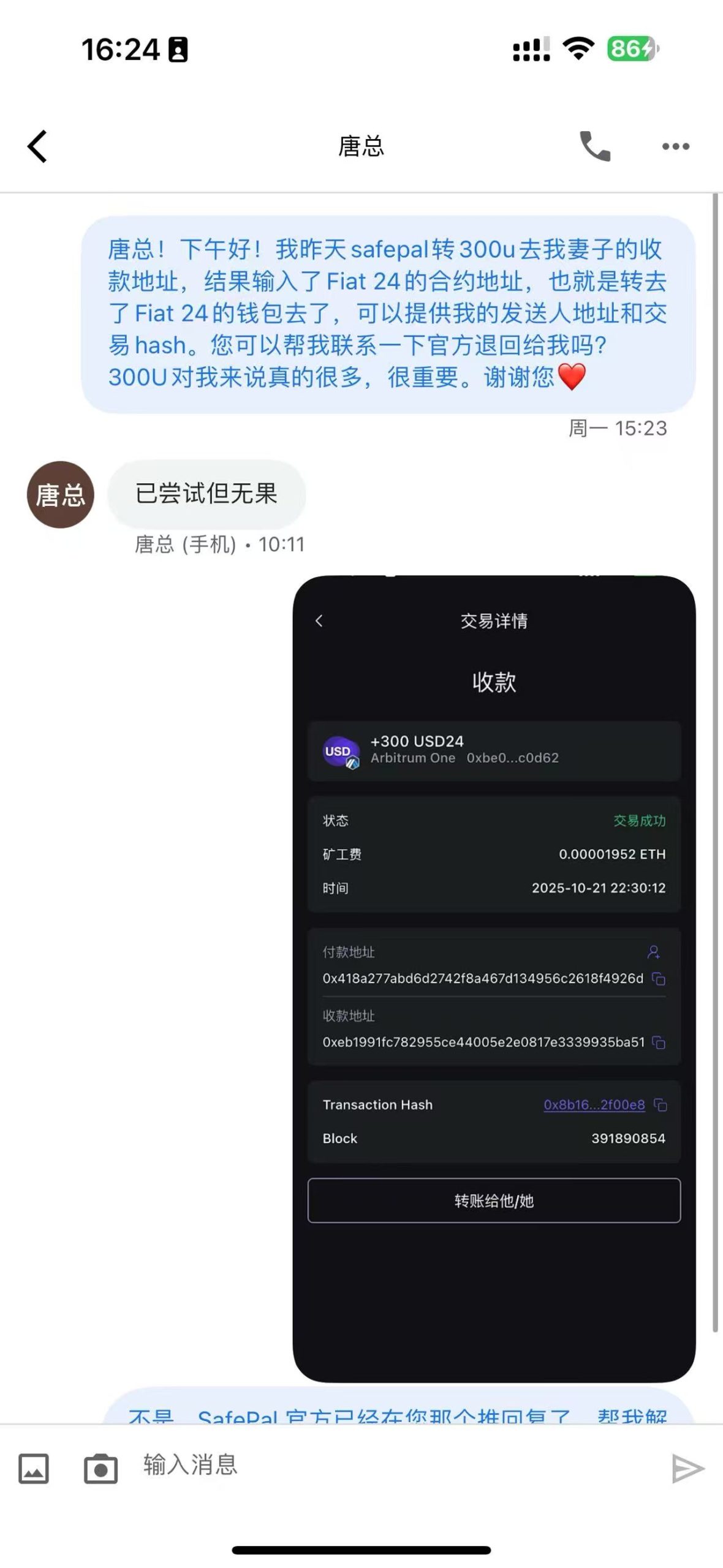2025年10月19日19点左右,我看妻子的safepal余额没剩多少了,于是就想着转一些USDC过去。我准备通过币安转USDC到我的safepal钱包,再从钱包转到妻子的钱包。问题就出现在扫描妻子的钱包地址,不知怎么粘贴的是Fait24官方的合约钱包地址……难怪迟迟没有到账,我一直在回忆自己的操作,查看交易hash,才发现发去了Fait24钱包,很纳闷的是,我是通过扫描的方式输入收款地址的,怎么会是Fait24的地址呢?不管怎样,这就排除了一些劫持的可能。回想起我从2018年开始交易数字货币,从来没出现过如此低级的错误,真是大意了!真是老猫烧须啊!