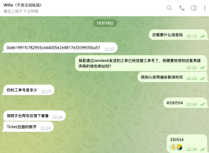 临睡前,又去逛了一下safepal的官方推特,发现他们有开设telegram群组,很贴心地为各个语言类作分区,刚进中文群我就在群里提出我的问题,看管理员是否可以协助我解决。没想到那些骗子一个接一个私聊我,或者直接假装管理员的名字和头像让我私聊他,不过这些基本的防范意识我还是有的。联系上管理员之后,让我提供了工单号,他那边也帮我跟进一下这件事。