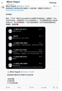 第二天10月20日,我在推特上看到zerobase的唐总在发推特抱怨很多人给他发短信,包括但不限于一些家长里短和在线乞讨的信息。我就想着我也给他发一个短信,让他帮我艾特官方会不会更有效、更受重视呢?反正试试也无妨,没想到晚上就看到唐总把我的信息放到推特,并且帮我艾特官方了。