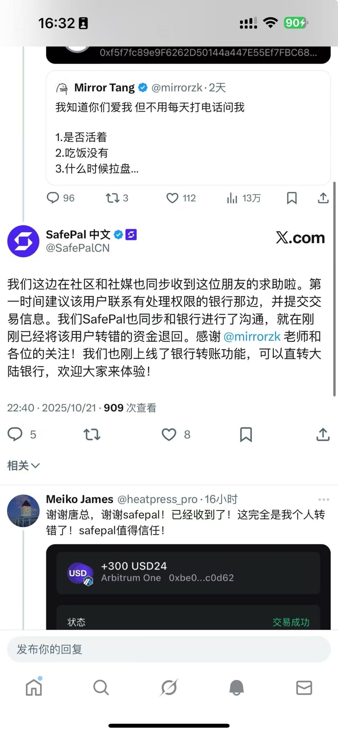 晚饭之后才发现需要我提供交易hash和收款地址,我提供完也没太理会了。直到晚上睡前逛了一下推特,发现safepal官方推特回复我说,已经退回到我的钱包,我急忙查了一下果然到账了!